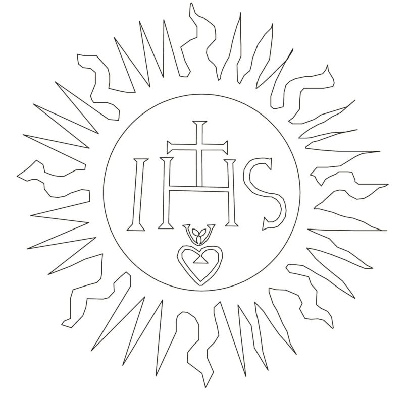 Iesus Hominum Salvator = Jesus sauveur des hommes Le monogramme du Christ IHS est souvent accompagné d'une croix latine et d'un coeur (Amour divin) avec les trois clous de la passion, le tout dans un cercle évoquant l'éternité sans commencement ni fin.